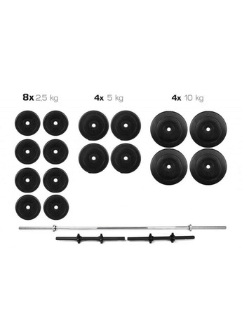 Штанга + Гантелі Набір Premium 101 КГ Представляємо набір навантажень (Штанга + Гантелі) із загальною вагою 101 кг. За допомогою даного набору Ви зможете повноцінно займатися зі штангою та гантелями як у спортзалі так і в домашніх умовах. Диски підходять до прямого, w-подібного і до гантельних гриф тому набір вважається універсальним. Ви зможете чергувати заняття зі штангою та гантелями, тим самим рівномірно опрацьовувати різні групи м'язів. Комплектація: Гриф прямою довжиною 180 см (1 шт) Вигнутий гриф довжиною 120 см (1 шт) Гриф короткий довжиною 45 см (2 шт) Млинці 10 кг (4 штуки) Млинці 5 кг (6 штуки) Млинці 2,5 кг (6 штуки)