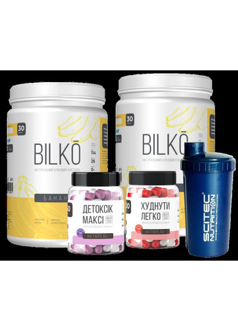 Комплект для схуднення: Натуральний Білковий Коктейль Bilko, Жироспалювач Худнути Легко, Детоксік Максі, Шейкер Відкрийте для себе повний комплекс для ефективного схуднення з нашою унікальною пропозицією! Комплект включає в себе: Натуральний Білковий Коктейль Bilko (2 банки по 0,9 кг, 60 порцій) - ідеальне джерело білка для підтримки м'язової маси і прискорення метаболізму. Натуральний склад забезпечує максимальну ефективність без шкоди для здоров'я. Жироспалювач Худнути Легко (100 капсул) - потужний жироспалювач, який допомагає прискорити процес спалювання жирів, збільшує рівень енергії та підтримує активний спосіб життя. Детоксік Максі (60 капсул) - ефективний засіб для детоксикації організму, що виводить токсини і покращує загальне самопочуття. Підтримує здоров'я печінки та покращує обмін речовин. Шейкер - зручний аксесуар для приготування коктейлів у будь-який час і в будь-якому місці. Легкість використання та практичність для вашого комфорту. Переваги нашого комплекту: Ефективне Схуднення: Білковий коктейль Bilko допомагає контролювати апетит, а жироспалювач прискорює процес спалювання жирів, сприяючи швидкому і стійкому зниженню ваги. Натуральні Інгредієнти: Усі продукти в комплекті виготовлені з натуральних інгредієнтів, що гарантує безпеку та високу ефективність. Комплексний Підхід: Одночасне використання білкового коктейлю, жироспалювача та детокс-засобу забезпечує комплексний підхід до схуднення і поліпшенню загального самопочуття. Зручність і Практичність: Шейкер дає змогу легко та швидко приготувати смачні та корисні коктейлі в будь-якому місці. Як використовувати: Білковий Коктейль Bilko: Змішайте одну порцію (30 г) з 250-300 мл води або молока, збовтайте в шейкері й насолоджуйтеся. Приймайте 1-2 рази на день, переважно після тренування і/або між прийомами їжі. Як і коли пити? 1. Випийте один коктейль замість сніданку, якщо вам не подобається ранкова їжа. 2. У день тренування до або після занять. 3. За 2 години до сну, щоб не навантажувати шлунок важкою їжею. 4. Візьміть із собою коктейль і пийте замість закуски. Протеїновий коктейль не є повноцінною дієтою. Ваш організм також потребує клітковини, жирів і вуглеводів. Включіть до свого раціону: каші, овочі, олії та горіхи. Використовуйте коктейль замість закуски і як додаткове джерело білка. В 1 порції (30 гр): Білків: 26 гр Вуглеводів: 0,9 гр Жирів: 1,0 гр Енергетична цінність: 114 ккал Доступні смаки: Шоколад Банан Ваніль Класичний (молочний) Полуниця Лісова ягода Склад: Гідролізований ізолят сироваткового білка (87%), натуральні та ідентичні натуральним ароматизатори, емульгатор - соєвий лецитин, сукралоза. Без цукру Без ГМО Жироспалювач Худнути Легко: Склад на порцію 2 капс: Ацетил-L-Карнітин – 200 mg L-Тирозин – 100 mg Вітамін В6 – 0,5 mg Спосіб застосування: Порція (2 капсули) вживати 1 раз на день внутрішньо, запиваючи водою, за 30 хв перед їжею. Увага: Не застосовувати при непереносимості. Зберігати щільно закритим у сухому місці при температурі від +1С до +25С Детоксік Максі: Склад на порцію 2 капс: Холін/розторопша – 200 mg Вітамін В6, калій – 100 мг Залізо, цинк/ехінацея – 100 мг Спосіб застосування: Порція (2 капсули) вживати один раз на день внутрішньо, запиваючи водою під час їжі. Попередження: Не застосовувати при нестерпності. Зберігати щільно закритим у сухому місці при температурі від +1С до +25С Замовте наш