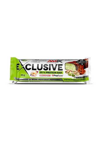 Amix Exclusive Protein Bar 25% – це протеїновий батончик із вмістом білка від 25%, створений для тих, хто дотримується активного способу життя й хоче мати під рукою зручний та поживний перекус. Вага 85 г робить його вдалим варіантом для тренувань, прогулянок або ситуацій, коли важливо швидко втамувати легкий голод. В основі Amix Exclusive Protein Bar 25% використовується комплекс MilkPro® – поєднання концентрату сироваткового білка CFM®, сироваткового ізоляту та ізоляту Provon IsoHi®, доповнених гідролізованими пептидами. Така комбінація забезпечує повноцінний амінокислотний профіль. Додатково до складу включені BCAA та L-глутамін, які підтримують білковий обмін і можуть бути корисними під час регулярної фізичної активності. Батончик сприяє підтриманню м’язової маси, допомагає урізноманітнити раціон, зручний у використанні та вирізняється приємними натуральними смаками. Близько 24 г білка в порції роблять його хорошим варіантом для тих, хто приділяє увагу кількості та якості протеїну в щоденному харчуванні. Amix Exclusive Protein Bar 25% підійде спортсменам та активним людям, для яких важливий збалансований перекус протягом дня. Поживна цінність в одному батончику (85 г) Калорійність 1536 кДж / 365 ккал Жири 14,3 г - з них насичені жири 6,5 г Вуглеводи 35,8 г - з них цукру 17,8 г Протеїн 23,4 г Сіль 0,6 г Склад MilkPro® Protein Blend 19,8% (ізолят молочного білка, ізолят і концентрат сироваткового білка CFM®, частково гідролізований ізолят сироваткового білка Provon IsoHi®, гідролізовані сироваткові пептиди PepForm® /L-глутамін, BCAA/), молочний шоколад 15% (цукор, какао-масло, сухе цільне молоко, какао-маса, какао-порошок, емульгатор: /соєвий лецитин, E476/, екстракт ванілі), ізоглюкоза, зволожувач: гліцерин; гідролізований яловичий пептид HydroBeef™, наповнювач: полідекстроза; сухе знежирене молоко, рослинні жири (пальмова олія та олія ши у різних пропорціях), ізолят соєвого білка, соєві пластівці, бланшовані ядра фісташок 3,8%, білий шоколад 3,8% (цукор, какао-масло, сухе молоко, суха молочна сироватка, лактоза, емульгатор: соєвий лецитин та полігліцерол-поліріцин-олеат; екстракт ванілі), швидкорозчинна рисова каша, мальтодекстрин, емульгатор: соняшниковий лецитин; очищена вода, ароматизатор, регулятор кислотності: лимонна кислота; барвник: мідний хлорофілін; антиоксидант: суміш токоферолів, соняшникова олія; сіль. Алергени: молоко, соя, пшениця.Інші алергени: деревні горіхи, арахіс. Може містити фрагменти горіхової шкаралупи. Фасування 1 батончик - 85 г, коробка - 12 батончиків. Як приймати Приймайте не більше 2 батончиків на день.