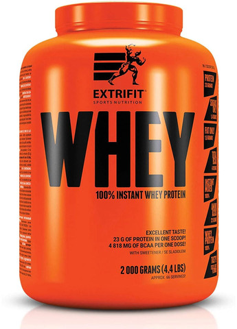 Протеїн 100% Instant Whey 2000g (Strawberry) Протеїн 100% Whey – це чистий сироватковий білок, повністю розчинний, із чудовими смаковими якостями й хорошою ціною. 4818мг БСАА та 23г білка в кожній мірній ложці! Ми створили протеїновий напій для кожного, хто бажає спробувати якість Extrifit і при цьому зекономити. Що таке сироватковий протеїн Протеїн – це високоякісна концентрована білкова структура, необхідна для збільшення м’язової маси й фізичної сили. Наш організм отримує протеїн разом з їжею, що містить білок ( м’ясом, молочними продуктами, яйцями, горіхами, бананами, бобовими, крупами, жирною рибою тощо ). У разі недостатньої кількості протеїну через великі фізичні навантаження під час тренувань і низькобілкову дієту альтернативою стане спортивний протеїн Extrifit WHEY (100% Instant Whey Protein ). Сироватковий протеїн найпопулярніший з усіх білків, оскільки він має повноцінний амінокислотний склад, високий рівень засвоєння та короткий період всмоктування. За невеликий проміжок часу сироватковий протеїн потрапляє в кров, тим самим підвищуючи концентрацію амінокислот та інтенсивно підживлюючи м’язи. Ці властивості роблять його дуже необхідним продуктом для вживання зранку й відразу після тренування. Як впливає сироватковий протеїн на наш організм • Є будівельним матеріалом для волокон м’язів і нарощування м’язової маси, для кісток та тканин усіх органів. • Збільшує енергетичний потенціал організму, зміцнюючи й підтримуючи імунітет. • Стабілізує рівень інсуліну в крові. • Відіграє значну роль у формуванні здорового й гарного тіла, адже зберігає м’язову масу в той час, коли зайва вага витрачається на енергетичні потреби організму. • Сприяє відновленню м’язів та всього організму після тренувань. • Підтримує водний баланс у тілі людини. • Забезпечує організм поживними речовинами під час низькокалорійної дієти. • Дозволяє замінити кілька прийомів їжі смачними коктейлями, урізноманітнивши ваш раціон. Склад продукту: Розчинний сироватковий протеїновий концентрат (100% вміст білка ); кава ( для смаку тирамісу ); какао ( для смаків шоколад, шоколад і кокос ); ароматизатор, згущувач; натуральний барвник бетакаротин ( для смаку банан ); екстракт буряка ( для смаків полуниця, чорниця та фруктовий коктейль ); підсолоджувач сукралоза. Вміст 1 упаковки 30г. Як вживати Extrifit WHEY (100% Instant Whey Protein ) Рекомендована денна норма – 2- 6 порцій. Доза залежить від ваги тіла, спортивної активності й складу раціону харчування. Вміст (30г ) розвести 220мл води або знежиреного молока, вживати зранку натщесерце, перед тренуванням та відразу після тренування.
