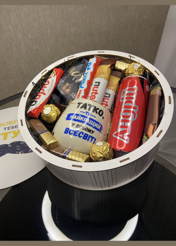 Подарунковий бокс «Татку, ти найкращий у Всесвіті» | Набір із горнятком та солодощами Опис: Слова любові + улюблені солодощі = ідеальний подарунок для найкращого татуся У стильному дерев’яному кошику — щира турбота, смаколики та теплий надпис на горнятку, який точно зворушить. У складі: ГОРНЯТКО з написом «Татку, ти найкращий у всьому Всесвіті!», 330 мл Kinder Maxi, 1 шт Kinder Duplo, 1 шт Батончик Nutella B-ready, 2 шт Парфуми Ferrero Rocher, 3 шт Волоський горіх в молочному шоколаді Nutte, 30 г Батончик ProteLine протеїновий глазурований зі смаком шоколаду, 40 г Шоколад Mersi, палітри, 3 шт. Напій Coca-Cola безалкогольний (ім`я на вибір), 250 мл Стильне пакування з декором Подарунок, який дарує не лише смак, а й емоції. Ідеально підійде для Дня батька, дня народження чи просто «без приводу, бо люблю». Розмір боксу: 21×9 см Готовий до вручення! Створено з любов’ю!