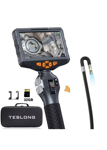 Відеоендоскоп Teslong TD500-DL з керованим поворотним зондом, діаметром всього 6,5 міліметра. Кут повороту камери 210 градусів, поворот можливий у двох напрямках. Ендоскоп Teslong TD500-DL має дві камери на зонді. Основна та бічна камери мають однаковий кут огляду 70°, та роздільну здатність Full HD. Відеоендоскоп оснащений трубчастим напівжорстким кабелем довжиною 1,55 метра, яких добре тримає задану форму, а також з його допомогою можна проштовхувати зонд під різними кутами або в місцях сильного забруднення. Управління поворотом зонда здійснюється за допомогою джойстика, розташованого на ручці основного блоку пристрою. Для зручності поруч із джойстиком поворотного зонда знаходиться кнопка регулювання підсвічування камери, а також кнопка фото/відео запису. Керований технічний ендоскоп Teslong TD500-DL має кольоровий дисплей діагоналлю 5 дюймів, на якому розташовані кнопки керування функціями пристрою (режими, налаштування, перегляд фото/відео записів, поворот або відображення зображення з камери, збільшення та інше). А також на бічній частині розташований порт для картки пам'яті MicroSD та вхід USB для заряджання. Живлення пристрою забезпечує вбудована батарея 3000 мАг, чого достатньо приблизно на 4 години автономної роботи. WiFi підключення Teslong TD500-DL, окрім того що виводить відео на власний екран і здатний записувати відео на карту пам’яті, також ще має можливість підключення до смартфону або планшету через WiFi і таким чином виводити зображення на ще один монітор, для більш зручного огляду наприклад одразу двома користувачами. Для цього потрібно увімкнути функцію WiFi в налаштуваннях. Основні особливості: Поворотний зонд з кутом повороту 210° Діаметр зонда із двома камерами: 6,5 мм. Довжина зонду: 2 см. Довжина поворотної частини: 3,7 см. Підсвітка фронтальної камери 6 світлодіодів, бокової - 1 світлодіод. Кут огляду обох камер: 70° Довжина кабелю: 1,55 метра Дисплей: 5 дюймів Батарея: 3000 мАг, 4 години автономної роботи Бездротовий зв’язок: WiFi Мобільний додаток: Smart Endoscope (для Android / iOS) Технічні характеристики: Камера основна: 2 МП; бічна: 2МП Роздільна здатність відео: Full HD 1920*1080P Формат відеозапису: MP4 Підтримка карт пам'яті MicroSD до 32 Гб Цифрове збільшення (ZOOM): є Кут огляду камери: 70 градусів Кут повороту зонда: 210 градусів Фокусна відстань камери: 45 – 70 мм Підсвічування зонда: 6 +1 LED світлодіоди Дисплей: кольоровий LCD IPS 5 дюймів Батарея: 3000 mAh Довжина кабелю: 1,55 метра Захист від вологи: IP67 Робоча температура: 0 - 45°C Комплектація: Керований ендоскоп Teslong TD500-DL USB кабель Насадки (магніт, гак) Футляр для зберігання Інструкція (eng)