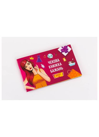 Є речі, які не купиш за гроші. Це любов і увага ― найцінніше, що ми маємо. Даруючи «Чекову Книжку Бажань», ви дарує вашій половинці саме ці безцінні речі ― любов і увагу. З цим подарунком ви зобов'язуєтеся виконати 12 простих, але водночас дуже приємних «квестів»-бажань вашої любої половинки. Чекова Книжка Бажань: Для Неї - це, безумовно, яскравий і оригінальний подарунок, який обов'язково порадує будь-яку дівчину. Як користуватися Чековою Книжкою Бажань: 1. Ваша супутниця, що стала власницею цієї Чекової Книжки, обирає чек, відриває і пред'являє його Дарувальнику, тобто Вам до виконання. 2. Тепер Вам необхідно виконати обране бажання, а їй залишається тільки насолоджуватися його виконанням. 3. Після того, як бажання виконано, їй необхідно поставити відмітки на корінці чека. 4. Чеки є одноразовими, можуть бути використані в будь-якому порядку, але не більше одного разу на добу. Включає такі бажання: 1. Улюблений сніданок у ліжко. 2. Вечір з подружками. 3. День для себе коханої (спа, салон краси, шопінг, ресторан). 4. Виконання будь-якої моєї примхи. 5. Повне підкорення впродовж одного дня. 6. Хочу весь день чути компліменти. 7. Будь-який вид масажу за бажанням. 8. День «Уліжкуваляння й Байдикування». 9. Будь-яке еротичне бажання. 10. Спільна поїздка на вихідні за моїм вибором. 11. Спільний похід на концерт / театр / кіно (обираю я). 12. Одна покупка, яку давно хотіла.