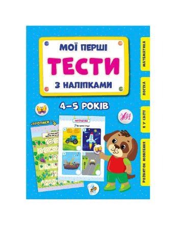 Видання «Мої перші тести з наліпками. 4–5 років» допоможе батькам перевірити обізнаність малюка за напрямками «Математика», «Логіка», «Я у світі» та «Розвиток мовлення». Запитання кожного розділу укладені відповідно до програм дошкільного розвитку та вікових особливостей дитини. Переглянувши варіанти відповідей, малюк має обрати один і позначити його наліпкою. Проходження таких тестів в ігровій формі зумовить поступове звикання до них й змалечку підготує дитину до тестової форми перевірки знань у майбутньому. Окремим додатком до тестів будуть кольорові прописи, що допоможуть дитині навчитися наводити по пунктиру лінії, фігури та візерунки. Видання сприятиме розвитку уваги, мислення й графічних навичок, тренуванню пам’яті й дрібної моторики пальців рук, спонукатиме до акуратності.