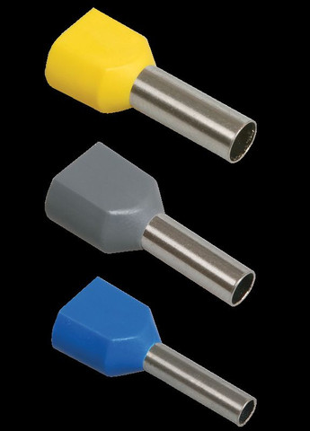 Виконують ті ж функції, що й наконечники-гільзи мідні калюжі (Е-глізи), але дають можливість віконцюванню не одного, а двох дротів. Технічні характеристики: Матеріал: Мідь Захисне покриття поверхні: Лужне Номін поперечне переріз: 2х2,5 мм2 Довжина гільзи або муфти: 10 мм Номін напруга: 400 В Температура експлуатації: -40...+80 °C Конструктивне виготовлення: Стандартний (-а) Ізоляційний матеріал: ПВХ (PVC)