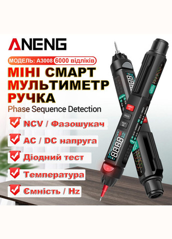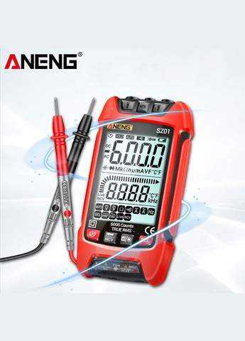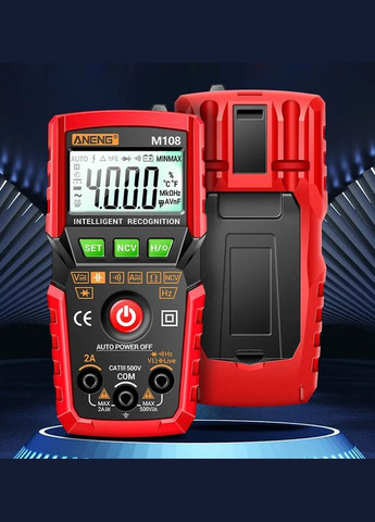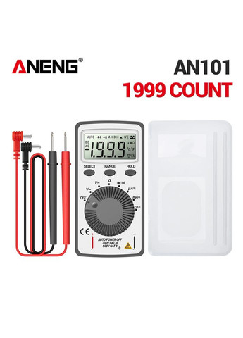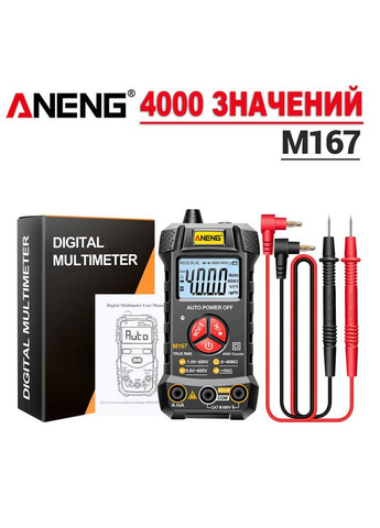 Професійний цифровий мультиметр ANENG AN8008 - це прилад, який дає змогу точно й швидко вимірювати електричні величини, які використовуються під час діагностики та ремонту різної електроніки. Цей цифровий мультиметр має автоматичний і ручний вибір діапазону вимірюваного параметра, що дає можливість швидких і точних вимірювань з використанням істинних середньоквадратичних значень. Прилад вимірює постійну й змінну напругу, силу постійного й змінного струму, електричний опір, ємність, частоту та робочий цикл. Прилад також має вбудований генератор прямокутних імпульсів, оснащений функцією продзвонки ланцюгів і тесту напівпровідників. Результати вимірювань відображаються на великому й функціональному РК-дисплеї розрядністю на 9999 відліків з підсвічуванням. Живиться пристрій від двох батарей типу AAA, а для економії їхньої енергії має функцію автоматичного вимкнення після 15 хвилин бездіяльності. Особливості: - Точне вимірювання постійної та змінної напруг, сили постійного та змінного струму, електричного опору, ємності, частоти та робочого циклу. - Прилад використовує True RMS, завдяки чому він обчислює реальне середньоквадратичне значення змінного струму й напруги як для синусоїдальної, так і для несинусоїдальної форми хвилі. - Можливість вимірювання сили струму в мікроамперах дасть змогу тестувати різні типи датчиків, наприклад, датчики полум'я в кліматичних пристроях. - Вбудований генератор прямокутних імпульсів має 15 налаштувань від 50 до 4000 Гц і допоможе, наприклад, під час діагностики акустичних систем. - Автоматичний підбір діапазонів вимірюваних параметрів і можливість вибору діапазону в ручному режимі для більш швидких вимірювань. - Висока точність при вимірюванні всіх параметрів, швидкий відгук, висока роздільна здатність й повторюваність результатів. - Великий цифровий РК дисплей з підсвічуванням і відображенням додаткових параметрів розрядністю на 9999 відліків. - Автоматичне вимкнення після 15 хвилин бездіяльності та індикація низького заряду батарей. - Функція утримання даних, тест напівпровідників (діодів, транзисторів), прозвонка ланцюгів. - Звуковий сигнал під час увімкнення/вимкнення та перемикання функцій пристрою. - Надійний захисний силіконовий чохол і складна задня підставка. Характеристики: - Бренд: ANENG. - Модель: AN8008. - Матеріал: АБС-пластик + силікон. - Матеріал тестових щупів: латунь/ПВХ. - Дисплей: РК з підсвічуванням. - Розрядність дисплея: 9999 відліків. - Метод вимірювання: True RMS. - Частота вибірки: 3 рази на секунду. - Автоматичне вимкнення: 15 хвилин без будь-яких операцій. - Джерело живлення: батареї 2*1,5 В AAA (НЕМАЄ В КОМПЛЕКТІ). - Розмір: 132x65x30 мм. - Вага: 113 г. - Колір: чорний із червоним. Мінімально і максимально можливі значення вимірюваних параметрів: - Частота: від 0,01 Гц до 9,999 МГц. - Ємність: від 0,001 нФ до 9,999 мФ. - Напруга змінного струму: від 0,001 мВ до 750 В. - Напруга постійного струму: від 0,001 мВ до 999,9 В. - Сила змінного струму: від 0,01 мкА до 9,999 А. - Сила постійного струму: від 0,01 мкА до 9,999 A. - Опір: від 0,01 Ом до 9,999 МОм. - Робочий цикл: від 1 до 99 %. - Генератор вихідних прямокутних сигналів: від 50 Гц до 4 кГц. - Тест на безперервність: від 0 до 50 Ом. - Тест напівпровідників: 5 мА, 3 В. Діапазони вимірюваних величин і точність: - Напруга постійного струму: 9,999/99,99 мВ/999 9,999 мВ/99,99 В/999,9 В (±0,5%+3). - Напруга змінного струму: 9,999 мВ/99,99 мВ/999 мВ/9,999 В/99,99 В/750,
