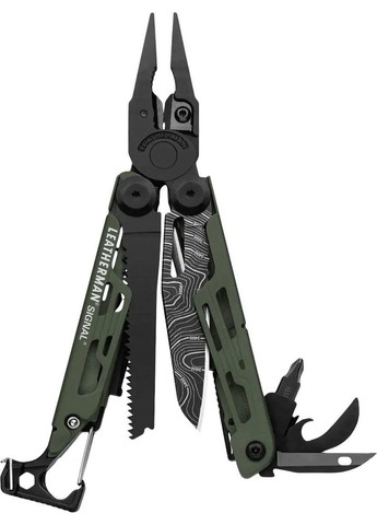 У новій модельній лінійці Signal мультитулів від торгової марки Leatherman традиційні та найбільш важливі інструменти поєднуються з новими: знімним кресалом, алмазним точилом для звичайних і серейторних клинків, свистком і навіть невеликим молотком. З мультитулом Leatherman Signal Ви будете готові до будь-якої ситуації. Інструменти: 1. Гострогубці 2. Плоскогубці 3. Знімні кусачки зі сталі 154СМ 4. Знімні кусачки для товстого дроту зі сталі 154СМ 5. Інструмент для зачистки проводів 6. Ніж із серейтором зі сталі 420НС 7. Пила, сталь 420НС 8. Молоток 9. Шило з отвором 10. Відкривачка для банок 11. Відкривачка для пляшок 12. Тримач для шестигранних біт ¼ дюйма 13. Тримач для великих біт 14. Накидний гайковий ключ ¼ дюйма 15. Карабін/відкривачка для пляшок 16. Накидний гайковий ключ 3/16 дюйма 17. Свисток 18. Кресало 19. Алмазне точило