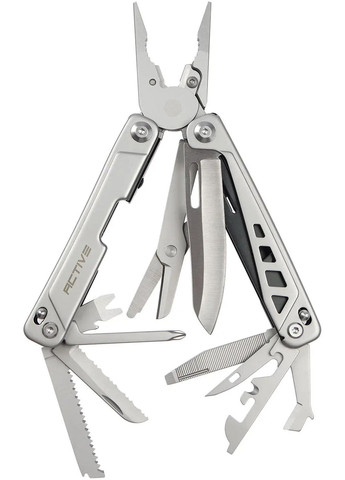 Мультитули бренду Active Knives&Tools - це сучасні, універсальні інструменти, головною відмінністю яких, є співвідношення ціни-якості в порівнянні з мультитулами інших брендів. Мультитули ідеально справляються з поставленими завданнями завдяки інструментам з високоякісної нержавіючої сталі. Ергономічні руків'я відмінно лежать в руці та забезпечують надійний хват. Це незамінні супутники як у повсякденному житті, так і під час відпочинку чи туризму. Active Launch – це серія багатофункціональних мультитулів від виробника Active Knives&Tools, що стане незамінним помічником, як у повсякденному житті, так і під час відпочинку або туризму. Руків’я, як і всі елементи мультитулів, виготовляються з високоякісної нержавіючої сталі. Більшість мультиінструментів у модельному ряду Launch мають кишенькові кліпси, вбудовані в руків’я карабіни та спеціальні кільця для темляка або підвісу страхувального троса. Будь-яка модель мультитулу з серії Launch від бренду Active Knives&Tools комплектується нейлоновим чохлом. Модель виконана з двох видів сталі: клинок, пилка та ножиці з нержавіючої сталі марки 440, інші інструменти і рукоятка - зі сталі марки 420. Інструменти: - Плоскогубці з кусачками; - Ножиці; - Клинок зі звичайною різальною крайкою; - Пилка для дерева; - Напилок + пласка викрутка; - Відкривачка для пляшок та консервний ніж + паз для зняття ізоляції + мала пласка викрутка; - Клинок із серейторною різальною крайкою; - Шило-кернер; - Інструмент для відкривання посилок; - Фігурна викрутка. Мультитул оснащено кишеньковою кліпсою та кільцем для темляка.