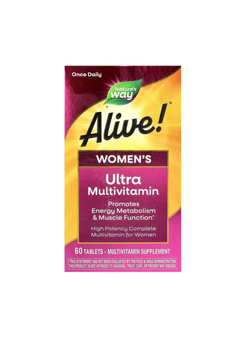 Штрихкод: 33674156865 Високоактивні вітаміни групи B допомагають перетворити їжу в енергію Energizer™ з харчовими сумішами та порошкові суміші Orchard Fruits™ і Garden Veggies™ (60 мг у 1 порції) Мультівітамінна добавка Отримайте максимальну користь від мультивітамінів! Порошкові суміші Orchard Fruits™ і Garden Veggies™ Суміш для підтримки серцево-судинної системи Суміш травних ферментів Суміш CranRx® Комплекс цитрусових біофлавоноїдів Суміш лінганів льону Грибна суміш для захисту організму Суміш Daily Greens™ з амінокислотами Суміш для підтримки волосся, шкіри та нігтів Збалансована формула для жінок Містить високоефективні вітаміни групи B, зокрема активну форму вітаміну B-12 і фолату Для здоров’я очей: бета-каротин (вітамін A), вітамін C, вітамін E, лютеїн, цинк Для здоров’я серця: вітаміни групи B, вітамін C, вітамін E Для енергетичного обміну: вітаміни групи B Для здоров’я кісток: кальцій, фолат, магній, марганець, вітамін D3, вітамін K Для здорової імунної системи: селен, цинк, вітамін A, вітамін C, вітамін D3 Для здоров’я шкіри: вітамін A, вітамін C, вітамін E, цинк Мультивітаміни Alive!® створені, щоб забезпечити вас енергією для всіх важливих справ. Отримайте максимальну користь від мультивітамінної добавки, у склад якої входять ефективні вітаміни, мінерали та харчові суміші, що надають бадьорості на кожен день! Рекомендації із застосування Рекомендація. Жінкам слід приймати по 1 таблетці в день, бажано під час їжі. Не підходить для чоловіків і дітей. Не перевищуйте рекомендовану дозу. Інші інгредієнти Целюлоза, стеаринова кислота, кроскармелоза натрію, діоксид кремнію, стеарат магнію, гіпромелоза, гліцерин, коричневий рис. Без глютена та штучних барвників.