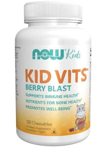 Вітаміни для дітей (Kid Vits) - це збалансований комплекс жувальних вітамінів, мінералів та інших важливих поживних факторів зі смаком свіжих ягід. Вегетаріанський продукт. GMP гарантованої якості. Виробник: Now Foods, США Форма випуску: 120 жувальних таблеток Вік: 1+ Склад: Компонент Склад 1 порції (2 жув. таблетки) Вітамін А 5000 МО Вітамін С 60 мг Вітамін D 200 МО Вітамін Е 30 МО Тіамін (вітамін В-1) 1.5 мг Рибофлавін (Вітамін В-2) 1.7 мг Ніацин (вітамін B-3) (як ніацинамід) 20 мг Вітамін B-6 (Піридоксину HCI) 2 мг Вітамін B9 (Фолієва к-та) 400 мкг Вітамін B-12 6 мкг Біотин 300 мкг Пантотенова кислота 10 мг Кальцій 20 мг Залізо 5 мг Йод 75 мкг Магній 10 мг Цинк 3 Марганець 0,1 мг Хром 120 мкг Молібден 75 мкг Калій 5 мг Холін 2 мг Інозит 2 мг ПАБК (пара-амінобензойна кислота) 2 мг Лютеїн 500 мкг Лікопін 500 мкг Інші інгредієнти: Целюлоза, порошок з кокосової олії, стеаринова кислота (рослинне джерело), буряковий порошок, ксантанова камедь, натуральні ароматизатори, яблучна кислота, діоксид кремнію, магнію стеарат (рослинне джерело). Не містить: Желатин, пшениця (клейковина), молоко, яйця, горіхи, арахіс, штучні ароматизатори, консерванти та похідні тваринного походження. Функціональна дія: Вітаміни для дітей, Now Foods, 120 таблеток - оптимальні для здорового зростання та розвитку дитини. Рівень вітаміну D 400 МО в одній порції. Дитяча мультивітамінна та мультимінеральна добавка. Немає штучних ароматизаторів чи барвників. Весело їсти – фруктовий приємний смак. Забезпечує необхідними вітамінами та мінералами для здорового росту та розвитку вашої дитини. Не містить желатину, підходить для вегетаріанців. Майже 80% дітей не отримують рекомендовану кількість багатих на поживні речовини фруктів та овочів. Ці полівітаміни для дітей забезпечать комплекс необхідних вітамінів та мінералів. Дитячі вітаміни містять вітамін А для здоров'я очей, вітаміни для енергетичного метаболізму та вітаміни С та D для імунної функції. Застосування: Діти від 4 років: приймати по 2 жувальні таблетки на день під час їжі. Діти від 1 до 3 років: приймати по 1-2 жувальні таблетки на день під час їжі.