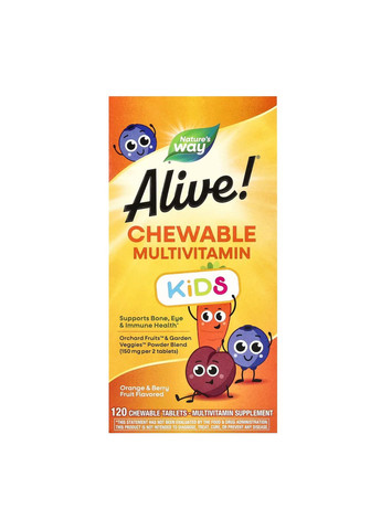Мультивітаміни для дітей Alive! Nature's Way 120 жувальних таблеток апельсин і ягоди Мультивітаміни для дітей Alive! Nature's Way – це унікальна добавка, спеціально розроблена для підтримки росту та розвитку ваших дітей. В кожній упаковці міститься 120 жувальних таблеток з приємним смаком апельсина та ягід, що робить їх прийом веселим і цікавим процесом. Ці мультивітаміни включають високоефективні вітаміни C, D та групи B, а також цитрусові біофлавоноїди і спеціальні суміші Orchard Fruits™ та Garden Veggies™, які сприяють зміцненню імунної системи та забезпечують необхідну енергію для активного способу життя. Мультивітаміни Alive! сприяють підтримці здоров'я кісток завдяки вмісту кальцію та вітаміну D3, а також допомагають у виробництві енергії на клітинному рівні завдяки вітамінам групи B та біотину. Вони не містять глютену та інгредієнтів, отриманих з молочних продуктів, що робить їх безпечними для дітей з харчовими алергіями. Рекомендується давати одну жувальну таблетку дітям віком 2-3 роки і дві таблетки дітям старше 4 років, бажано під час їжі. Важливо, щоб дитина ретельно жувала таблетки перед ковтанням. Мультивітаміни Alive! – це чудовий спосіб забезпечити вашу дитину всіма необхідними вітамінами та мінералами для здоров'я та активного росту. Вони виготовлені компанією Nature's Way, відомою своїм якістю та безпечністю. Підтримайте здоров'я вашої дитини з мультивітамінами Alive! і подаруйте їй енергію для кожного дня.
