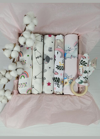 До боксу входить: Плед з в'язаного полотна 90х90 Муслінова плед-пелюшка 120х120 Багаторазові непромокаючі пелюшки 50х80 - 3шт Фланелеві м'які та ніжні пелюшки 80х100- 3 шт Багаторазові непромокаючі пелюшки 80х100 - 2шт Бряскальце Ведмежа ЕКО гризунець"Шурухливі вушка Тримач для пустушок гризунів тощо