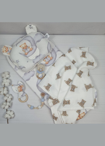 До набору входить: Простирадло на резинці в візочок Ортопедична подушка для немовлят Іграшка гризунець Шурухливі вушка + тримач ( для брехунців, гризунків тощо) Бряскальце "Ведмежа" Мусліеновий плед-пелюшка Увага! Розташування малюнка на виробі може відрізнятися від того, що на фото.