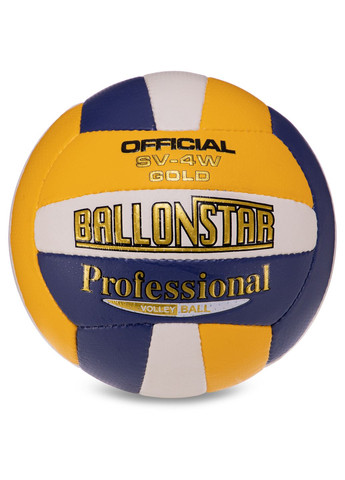 М'яч волейбольний BALLONSTAR SV-4W-01Розмір: 5 (стандарт) М'яч призначений для гри в пляжний волейбол на вулиці та в приміщенні. Покришка виготовлена з поліуретану. Це відмінний замінник шкіри, що відрізняється підвищеною міцністю та стійкістю до впливу вологи. Панелі м'яча між собою пошиті вручну. Такий метод з'єднання панелей дозволяє зробити м'яч невразливим до впливу вологи та досить міцним. Три шари підкладочного матеріалу забезпечують надійний захист камери від пошкоджень та ідеальну сферичну форму м'яча. Конструкція м'яча складається із 18 панелей. Камера витримує тиск у межах 0,29-0,32 BAR.Волейбольний м'яч можна використовувати у приміщенні та на вулиці. М'ячі такого типу відмінно підійдуть для навчальних закладів для уроків фізкультури, а також для розваг та відпочинку на природі. Завдяки міцному матеріалу покришки м'яч прослужить тривалий час. А підкладка не дозволить йому деформуватись. М'ячі з ручною зшивкою панелей відмінно підходять для аматорського волейболу та розваг. Це хороший подарунок для дитини, яка приверне його до активного способу життя та занять спортом. Характеристики:Розмір: 5Матеріал: Поліуретан (PU)Тип з'єднання панелей: Ручний шов Кількість панелей: 18 панелейМожна використовувати у приміщенні та на вулиці.Панелі з'єднані між собою методом ручної зшивки.Покришка з високоякісного поліуретану.Підходить для аматорського волейболу, навчання та розваг. У нас ви придбаєте лише оригінальні м'ячі. Ми цінуємо свою репутацію!