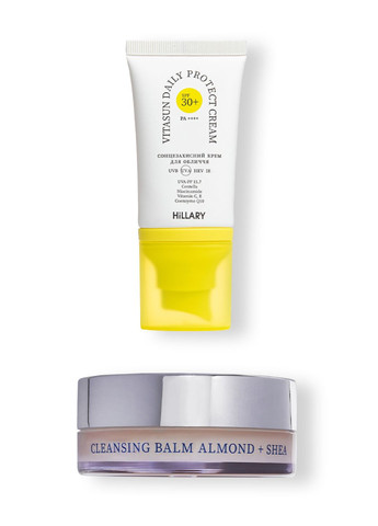 Наш преміумний набір догляду за шкірою цього сезону - це ідеальне поєднання натуральних інгредієнтів та ефективності. Ніжний бальзам ефективно видаляє макіяж і бруд, не подразнюючи шкіру та не залишаючи на ній неприємної жирної плівки. Бальзам на основі мигдальної олії та ефірів ши має консистенцію, що нагадує чисту олію ши та легко тане на сухій шкірі обличчя, очей і губ. Розчиняє залишки декоративної косметики та очищує пори від надлишків шкірного себуму. При контакті з водою перетворюється на ніжне молочко. Легко змивається, не залишаючи жирної плівки. Санскрін для щоденного використання з потужним захистом від UVA, UVB, HEV та IR випромінювання. Ідеально підійде для схильних до пігментації та світлошкірих людей, а також тих, хто тривалий час перебуває на сонці. Мікс фільтрів останнього покоління Uvinul A plus B, Tinosorb М та Tinosorb S забезпечує потужний захист шкіри від сонця в умовах міста, адже працює при нанесенні у невеликих кількостях, не вимагає поновлення протягом дня та служить чудовою базою для макіяжу. До набору входять: - Сонцезахисний крем для обличчя SPF 50+ Hillary VitaSun Daily Defense Cream, 40 мл - Очищувальний бальзам для зняття макіяжу для всіх типів шкіри Hillary Cleansing Balm Almond + Shea, 50 мл Спосіб застосування: 1. Нанесіть очищувальний бальзам пальцями на сухе обличчя, зокрема губи й очі. Злегка помасажуйте, потім додайте трохи води й знову м'яко помасажуйте, щоб олія перетворилася на молочну емульсію. Ретельно змийте водою. 2. Невелику кількість крему spf нанесіть на очищену шкіру обличчя дуже тонким шаром. Зачекайте 2-3 хв та нанесіть другий тонкий шар. В умовах пляжу чи тривалого передування на активному сонці необхідно оновлювати захист кожні 2 години. Застереження Натуральна косметика не є гіпоалергенною. За 24 години до застосування проведіть алергопробу на згині ліктя.