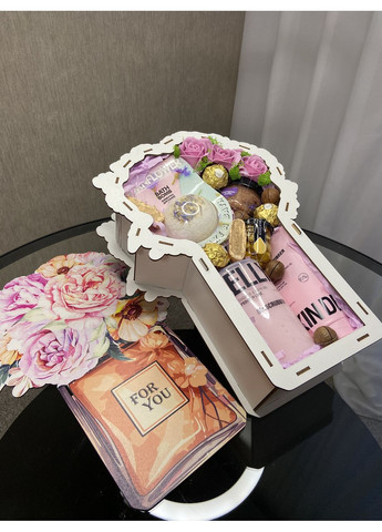 Подарунковий бокс у формі парфуму «For You» з косметикою та солодощами (34×24×9 см) Стильний, ніжний і наповнений турботою — цей подарунковий набір стане ідеальним сюрпризом для особливої людини. Витончена коробка у формі парфумної пляшечки «For You» приховує у собі все, щоб подарувати справжні моменти насолоди: ароматну бомбочку для ванни, преміальні солодощі та доглядову косметику, яка огорне шкіру ніжністю. Що всередині: Бомбочка для ванни з натуральними компонентами Cornflower Mr.SCRUBBER, 200г Гель для душу Jelly Bubbles Peony in Love Mr.SCRUBBER, 500 мл Зволожувальний крем-гель для тіла Skin Delights Peony in Love Mr.SCRUBBER, 150 мл Вишукані цукерки Ferrero Rocher, 3 шт Преміальний шоколад Gianduja, 2 шт. Фундук у меду, 50 г Мед-мус смородиналанда, 170 г Горіх макадамія в шкаралупі, 4 шт Мильні троянди та декоративний стабілізований мох, що створюють атмосферу свята та ніжності боксу Коробка розміром 34×24×9 см не лише вражає дизайном, але й стане практичною після використання — її можна зберегти як скриньку для пам’ятних дрібниць. Чудовий вибір для подарунка на День народження, 8 Березня, День матері чи просто для приємного сюрпризу без приводу. Коли хочеться подарувати красу, ніжність і емоції — обирайте “For You”!