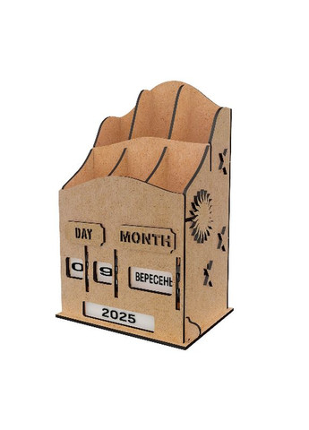 Більше, ніж просто календар Це не просто органайзер для ручок і канцтоварів. Стильний, з вінтажною ноткою вічний календар від Fabrika Decoru, який стане справжньою окрасою вашого столу. Він послужить і функціональним аксесуаром, і оригінальним подарунком для близьких. Забудьте про набридлі кубики! Унікальний механізм на коліщатках дозволяє встановлювати дату — день, місяць і рік — простим обертанням. Керувати часом ще ніколи не було так просто! А для тих, хто любить стильні та незвичайні речі, ми створили набори з готовими дизайнерськими принтами. Всього пара простих рухів: відокремте зображення від основи і наклейте його на деталь. Так ваш органайзер миттєво перетвориться на яскраву прикрасу, без необхідності в складному декупажі. Ключові особливості Багатофункціональність: Верхні комірки ідеально підходять для зберігання канцелярії, аксесуарів, косметики або навіть спецій на кухні. Проста і швидка збірка: Деталі легко з'єднуються без складних інструментів і практично не вимагають клею завдяки точному лазерному різанню. Якісний матеріал: Органайзер виготовлений з міцного та екологічного HDF товщиною 3 мм, який стійкий до навантажень і прослужить довгі роки. Простір для творчості: Базова крафтова версія ідеально підходить для фарбування, декупажу та будь-якої іншої техніки декорування. Бонуси в комплекті: Набір включає декоративні написи (Day, Month, Year), фігурки (сонце, місяць, зірки) і наклейки з цифрами та назвами місяців. Інструкція по збірці Акуратно витягніть всі деталі з основи. Зберіть конструкцію, дотримуючись покрокової інструкції, що додається. Зафіксуйте на відповідних деталях наклейки з місяцями, числами і роками. Якщо ви придбали набір з ілюстраціями — наклейте їх на деталі перед складанням. При необхідності використовуйте клей для надання конструкції максимальної міцності. Доступні дизайни Ми пропонуємо кілька варіантів органайзера, щоб він ідеально вписався у ваш інтер'єр: Базові версії (без малюнка): Білий ламінований HDF; Чорний ламінований HDF; Золотий Дуб Крафт HDF; Крафтова версія з шліфованого HDF для самостійного декорування за допомогою фарб, паст, трафаретів і різних декоративних елементів. Тематичні набори (з готовими ілюстраціями): Це комплекти зі звичайного шліфованого або ламінованого HDF з набором якісних самоклеючих принтів для створення унікального дизайну: від квіткових мотивів до камуфляжу. Характеристики: Стан: нове Вікова група: Від 14 років Матеріал: дерево Колір: дерево Упаковка: Картонна коробка Вид: Набір для творчості Вік: Від 14-ти років Гарантія: 14 днів Стать: Унісекс Країна реєстрації бренду: Україна Країна-виробник товару: Україна