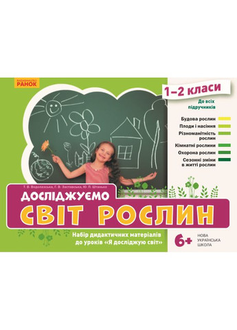 «Досліджуємо світ рослин» — один з наборів дидактичних матеріалів, що входить до серії «Досліджуємо світ природи». Набір створено для введення дитини у світ науки в цікавій ігровій формі, набуття нею досвіду перших відкриттів у світі природи, пошуку відповідей на численні «чому?». Набір дидактичних матеріалів не тільки зацікавить дітей та вчителів, але й стане помічником на уроках і в сімейних розвагах та дитячих іграх.