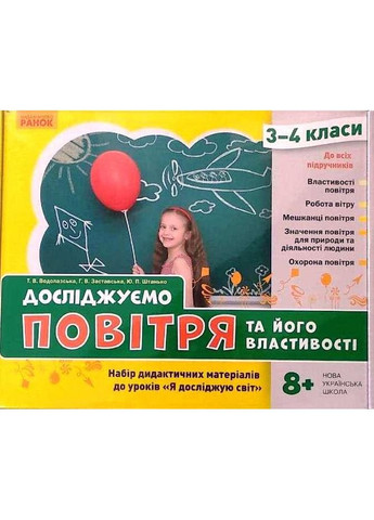«Досліджуємо повітря та його властивості» — один з наборів дидактичних матеріалів, що входить до серії «Досліджуємо світ природи». Набір створено для введення дитини у світ науки в цікавій ігровій формі, набуття нею досвіду перших відкриттів у світі природи, пошуку відповідей на численні «чому?». Набір дидактичних матеріалів не тільки зацікавить дітей та вчителів, але й стане помічником на уроках і в сімейних розвагах та дитячих іграх.