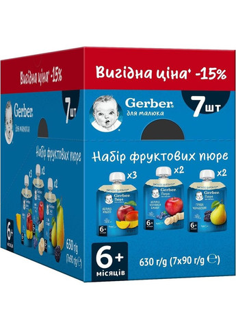 Набір фруктових пюре Gerber (Гербер) - чудовий варіант здорового та збалансованого перекусу для дитини. Набір складається з: фруктове пюре Gerber Яблуко та манго для дітей з 6 місяців, 90 г - 3 шт. фруктове пюре Gerber Яблуко, чорниця, банан для дітей з 6 місяців, 90 г - 2 шт. фруктове пюре Gerber Груша та чорнослив для дітей з 6 місяців, 90 г - 2 шт. Основні переваги: пюре має ніжну однорідну консистенцію у складі 100% натуральні фрукти, багаті на вітаміни та корисні речовини відмінно підходить для розширення раціону та розвитку смакових уподобань дитини виготовлено без ГМО, штучних консервантів, барвників та ароматизаторів, крохмалю та цукру м'яку упаковку "пауч" легко брати на прогулянку, в подорож чи гості сприяє розвитку навичок самостійності у малюка Спосіб приготування: пюре вже готове до вживання годуйте дитину під наглядом і тільки в положенні сидячи почніть годування з 1 чайної ложки, поступово збільшуючи обсяг діти до 12 місяців: зніміть кришечку та видавіть пюре на ложечку діти старше 12 місяців можуть самостійно вживати продукт безпосередньо з упаковки під наглядом дорослих Характеристики Вага: 630 г (7 шт. x 90 г) Виробник: Gerber, Польща. Рекомендовано для дітей від 6 місяців.