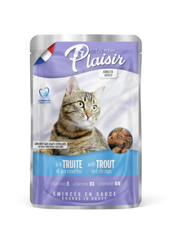 Ваш кіт точно буде задоволений та вдячний за таку вишукану французьку страву. Якби ви повели свого вихованця в котячий ресторан, то там він точно замовив би форель з креветками під витонченим французьким соусом! Ця страва підходить для стерилізованих котів і навіть рекомендована їм, тому що склад консервів ідеально збалансований за кількістю білків та жирів. Ваш вихованець буде ситий, здоровий, а вага не збільшиться. Французи, як ніхто, розуміються на смачній і корисній їжі, яка не призводить до ожиріння. Смачно – не означає калорійно, склад Adult Sterilized Cat Trout&Shrimps Chunks In Gravy розроблений фахівцями компанії Plaisir у тісному контакті з кращими європейськими дієтологами та ветеринарами, тому не тільки подобаються тваринам, а й підтримують їх в ідеальній фізичній формі довгі щасливі роки на всіх етапах життя. Переваги та особливості: якісний корм для стерилізованих котів; форель із креветками люблять коти та кішки; вишуканий соус вразить навіть котів-гурманів; склад ідеально збалансований та не призводить до набору ваги; повнораціонне харчування; зручне упакування. Склад: м'ясо та м'ясні субпродукти, молюски та ракоподібні (включаючи креветок 4%), риба та рибні субпродукти (включаючи форель 4%), похідні рослинного походження, екстракти рослинного білка, мінерали, різні цукри. Аналітичний склад: сирий білок 9,0%, сира клітковина 0,5%, вміст жиру 4,5%, сира зола 2,5%, вологість 82,0%. Добавки харчові: вітамін Е (3а700) 30 мг, таурин (3а370) 220,93 мг, вітамін С 96,40 мг, вітамін В1 (3а821) 2,35 мг, біотин 0,01 мг, мідь (3b405) 0,29 мг, йод (3b201) 0,15 мг, марганець. (3b503) 1,80 мг, цинк (3b605) 15,27 мг, DL-метіонін (3c301) 2172 мг Рекомендації щодо годування: давати корм кімнатної температури. Для дорослого кота з нормальною активністю давайте кілька прийомів їжі на день у зазначених кількостях. Рекомендується адаптувати кількість корму до рівня активності, породи та віку вашого кота. Зберігати у холодильнику (+4°C) після відкриття. Слідкуйте, щоб у тварин завжди був доступ до свіжої питної води. Вага дорослого кота, кг 3 260 4 320 5 360 Вага стерилізованого кота, кг Кількість корму на добу, г 3 200 4 240 5 280 Фасування : 100 г Пакування : 22 шт. х 100 г Виробник : Les Repas Plaisir, Normandise Petfood, Франція