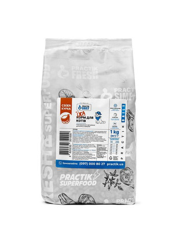 Корм PRACTIK Daily з куркою підходить для стерилізованих кішок та кастрованих котів. Він не містить штучних барвників, ароматизаторів, консервантів, глютену, сої та пшениці, що робить його безпечним вибором для щоденного харчування. Переваги сухого корму з куркою для котів Practik Daily: Преміум якість за доступною ціною. Свіжа курка як головне джерело високоякісного білка. Підходить для стерилізованих та кастрованих котів. Контроль pH, знижений магній, оптимальне співвідношення кальцію та фосфору для здоров'я сечової системи. Комплекс Digest Ease Blend з пробіотиками, пребіотиками та псиліумом для здорового травлення. Псиліум сприяє виведенню грудочок шерсті. Омега-3, Омега-6, арахідонова кислота та таурин для загального здоров'я. Натуральні вітаміни, ягоди, овочі та трави для зміцнення імунітету. Не містить глютену, сої, пшениці, штучних барвників, ароматизаторів та консервантів. Дбаєте про здорове харчування для котика? В нашому каталозі можна купити сухий корм для котів, що задовольнить найвибагливіші смаки та забезпечить пухнастику повноцінне здоров'я. Склад: Інгредієнти тваринного походження (56 %): М'ясо курки дегідроване — 36 % М'ясо курки свіже — 10 % Жир курячий — 6 % Печінка куряча — 3 % Олія лосося — 1 % Рослинні інгредієнти (38 %): Кукурудза — 33 % Овес — 5 % Корисні добавки (6 %): Комплекс S.N. Vitamins — 3 %: вітаміни, мінерали, таурин, яблука сушені, люцерна, куркума, чорна смородина, розмарин, ромашка Комплекс Digest Ease Blend для травлення — 1 %: псиліум (розчинна клітковина), пребіотики (β-глюкан нерозчинна клітковина), пробіотики (B. licheniformis, B. subtilis) Пивні дріжджі — 1 % Насіння льону — 1 % Альфа-токоферол (антиоксидант) Аналітичний склад / 100 г: Протеїн — 32 % Жир — 12 % Омега 6 — 2,3 % Омега 3 — 0,5 % Клітковина — 3 % Зольність — 6,4 % Вологість — 10 % Таурин — 0,25 г Рівень pH: 6-6,5 Енергетична цінність: 370 ккал / 100 г Мінерали / 100 г: Кальцій — 1,4 г Фосфор — 1,1 г Калій — 1,1 г Натрій — 0,42 г Хлорид — 0,25 г Магній — 0,08 г Мікроелементи / 100 г: Мідь — 1,2 мг Йод — 0,28 мг Залізо — 10 мг Марганець — 3,5 мг Селен — 32 мкг Цинк — 12 мг Вітаміни / 100 г: Vitamin А — 2000 МО Vitamin D — 125 МО Vitamin E — 24 МО Vitamin B1 (Thiamine) — 1 мг Vitamin B2 (Riboflavin) — 1,2 мг Vitamin B3 (Niacin) — 4,7 мг Vitamin B4 (Choline) — 290 мг Vitamin B5 (Pantothenic acid) — 2,7 мг Vitamin B6 (Pyridoxine) — 1 мг Vitamin B7 (Biotin) — 39 мкг Vitamin B9 (Folic acid) — 140 мкг Vitamin B12 (Cyanocobalamin) — 4 мкг Vitamin С — 30 мг Рекомендації з годування: Добова норма корму індивідуальна та залежить від породи, активності, віку собаки і середовища. Спостерігайте за улюбленцем і за потреби коригуйте дозування. Вага кота (кг) Добова норма (грамів) Зниження ваги Підтримання ваги Набір ваги / Реабілітація 2 50 60 70 3 50 70 80 4 70 80 90 5 80 90 100 6 85 95 105 7 90 100 110 8 95 105 115 Вагітність/лактація: збільшуйте норму на 25%. Перший прикорм: розмочуйте гранули за 1-2 години до годування. Завжди забезпечуйте доступ до чистої питної води. Термін придатності: 12 місяців від дати виробництва. Умови зберігання: зберігайте корм у сухому, прохолодному місці (від +5°C до +25°C), якомога далі від сонця та тепла. Після кожного використання щільно закривайте упаковку, уникаючи контакту з водою чи вологим повітрям, для збереження свіжості.