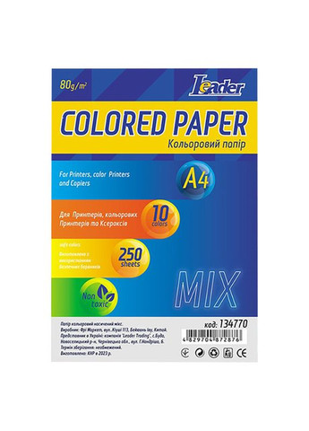 Набір кольорового паперу А4, 80г/м2, NEON, 5кол., 50л. BM.2721550-99 ТМ BUROMAX Двосторонній кольоровий папір BUROMAX – для життя, для роботи, для навчання, для творчості, для дому! Переваги: •Висока насиченість та однорідність кольору •Широкий асортимент кольорів та міксів кольорів •Пофарбований по всій масі – кольоровий, в тому числи, на зрізі •Абсолютно безпечний для використання як дорослими, так і дітьми з наймолодшого віку – папір не містить важких металів та токсичних елементів*. Границі міграції хімічних елементів з кольрового паперу не перевищують норми, дозволені для дитячих іграшок, що підтверджено відповідними документами! Характеристики: •формат А4; •щільність: 80 (g / m2); •упаковка кожного набору має захисний клапан на клейовій основі, який призначений для багаторазового використання та забезпечує безпечне зберігання та транспортування набору протягом всього періоду роботи з папером; •упаковка: пакет з міцної прозорої плівки з повнокольоровим друком та європідвісом. Універсальний папір для використання у всіх сферах життя: •ДРУК: можливий двосторонній друк на домашній та професійній техніці: кольоровий лазерний друк, струменевий друк, виготовлення кольорових копій, друк білим тонером на темному папері •РЕКЛАМА: для створення яскравих друкованих рекламних оголошень •РОБОТА: для систематизації документів за змістом, розділами або відділами за допомогою кольорів •НАВЧАННЯ: для оформлення наукових робіт, рефератів, дипломів тощо •РОЗВИТОК ДИТИНИ ТА ТВОРЧІСТЬ: для різноманітних поробок з паперу, в тому числі, для квілінгу, завдяки профарбованості по всій масі, в тому числі, на зрізі •ОФОРМЛЕННЯ: для цікавих декорацій, запрошень на свята або визначні події, оформлення приміщень Папір BUROMAX – Розфарбуй свої ідеї в прекрасні кольори життя!