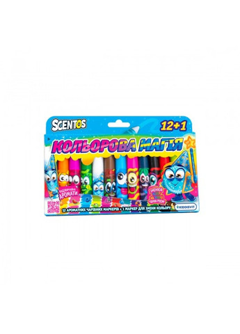 Набір ароматних маркерів для малювання, що змінюють колір - КОЛЬОРОВА МАГІЯ - це щось неймовірне! Ваші малюки будуть у захваті від чудових ароматів знайомих маркерів Scentos та від їхніх нових чарівних властивостей. У наборі 12 яскравих ароматних маркерів та 1 чарівний Просто намалюйте щось та проведіть по малюнку чарівним маркером - і Ви побачите, як малюнок змінює колір. Варіанти зміни кольору зображені на пакуванні. Маркери зручні для дитячих ручок. Аромати натурального походження. У наборі 12 кольорових маркерів з фруктовими ароматами натурального походження та 1 маркер для зміни кольору. Збери всю колекцію маркерів з божевільними фруктами від Scentos! Рекомендовано для дітей віком від 3-х років.