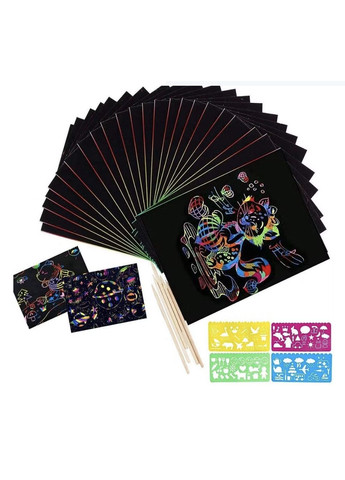 Малюється м'яко та легко, дерев'яна паличка знімає верхню чорну кулю. Під чорною кулею різнокольоровий картон. Скретч-аркуші ідеально підходять як для маленьких, так і великих художників. Набори дуже практичні під час подорожей. Використовувати можна для багатьох цілей, малювати, робити примітки, створювати картини, малювати та ще багато іншого потрібна тільки дитяча фантазія. Ідеальний вихід для художніх думок ваших дітей. Комплектація: 20 карток (18.2 x 24.5 см) 2 стилуси та 4 різні шаблони. Великий набір: що включає 20 скретч-аркушів, 4 шаблони для малювання, які містять багато форм. Вам не потрібно хвилюватися, що ваша дитина не знає, який візерунок вона хоче намалювати. Творчі розваги. Гра зі скретч-картками — це творче заняття, яке стимулює воображення і чудовий спосіб розвинути творчі інтереси.