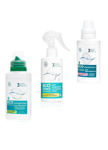 В наборі - ЕКОконцентрат для видалення плям різного походження. 250 мл - ЕКОспрей натуральний для видалення застарілих плям 200 мл - ЕКОконцентрат кисневмісний для відбілювання. 250 мл ЕКОконцентрат для видалення плям різного походження Призначення: Використовується для білих і кольорових виробів із бавовняних, лляних, віскозних, синтетичних і змішаних тканин. Не використовувати для виробів із шовку та вовни. Дія: Видаляє плями органічного походження, зокрема змішані: молочні продукти, кров, піт, трава, чай, кава, соки, фрукти, овочі, олія, майонез, соуси, вино, тваринний жир, шоколад, косметичні засоби тощо. Зберігає яскравість кольорів і захищає волокна тканин від передчасного зношування. Підвищує мийну здатність основного засобу, покращує якість прання. СПОСІБ ВИКОРИСТАННЯ Для використання в машинах будь-якого типу і ручного прання. Перед використанням збовтати. Нанести концентрат на попередньо зволожену забруднену ділянку виробу і залишити до подальшого прання. Випрати. З метою покращення якості прання можливе використання концентрату (20-30 мл) разом з основним засобом під час прання або попереднє замочування (20-50 мл на 3 л води). Оптимальна температура прання — від 30°С до 40°С. - Для покращення дії ферментів рекомендується перед пранням попереднє замочування білизни з ЕКОзасобом за температури до +40°С на 30 хв. - При використанні порошку можливе зменшення прального засобу до 50% без втрати мийного ефекту. - Висока концентрація ензимів у складі засобу дозволяє його використання з метою попередження забруднення каналізаційних труб раковин, ванн, душових кабін: налити 20 мл засобу в стічний отвір, не змивати мінімум 30 хв. НЕ МІСТИТЬ Хімічних ПАР, SLS/SLES, оптичних відбілювачів, силіконових піногасників, фосфатів, фосфонатів, цеолітів, полімерів, запашок, барвників. ЕКОспрей натуральний для видалення застарілих плям Призначення: Використовується для білих і кольорових виробів з тканин усіх типів, зокрема й делікатних. Дія: Чудово видаляє більшість складних плям і стійких забруднень. Ефективно впорається з жировими плямами, плямами від кави, чаю, вина, какао, овочів, фруктів, крові, дитячого харчування, трави, соків, соусів, шоколаду, риби, молочних продуктів, косметики, клею, кулькової ручки тощо. Усуває специфічні стійкі забруднення від поту. Видаляє потертості на комірцях і манжетах і може використовуватись для їхньої швидкої обробки перед пранням. Надає приємного аромату речам. СПОСІБ ВИКОРИСТАННЯ Рівномірно розподілити концентрат на попередньо зволоженій забрудненій ділянці виробу і залишити до подальшого прання. Згодом випрати речі. - Найкраще плямовивідник працює на свіжих забрудненнях, що попередньо не піддавались пранню: свіжу пляму необхідно обробити засобом і залишити до прання на необмежений період. - Спрей рекомендується використовувати для делікатного виведення забруднень із комірців та манжетів блуз і сорочок з метою перешкоджання їх потертості. НЕ МІСТИТЬ Хімічних ПАР, SLS/SLES, оптичних відбілювачів, силіконових піногасників, фосфатів, фосфонатів, цеолітів, полімерів, запашок, барвників. Призначення: Для білих і кольорових тканин усіх типів. Для водостійких поверхонь (кахель, кераміка, скло, пластик, гума, дерево, емальовані поверхні тощо). СПОСІБ ВИКОРИСТАННЯ Для виведення плям: нанести засіб на пляму, попередньо змочи