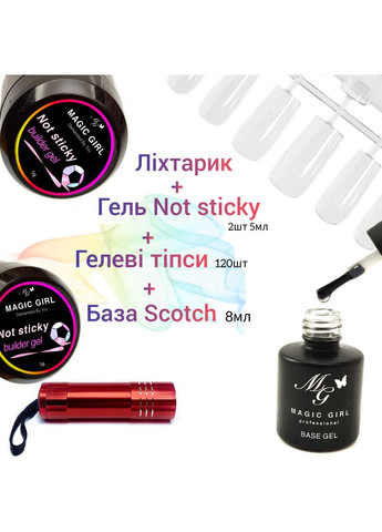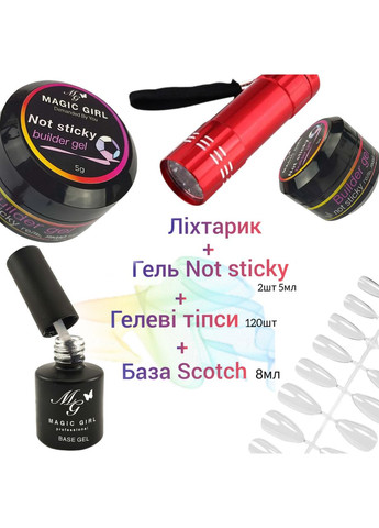 Тепер нарощування стало швидким і легким процесом, який зможе зробити кожна з вас Вигідна пропозиція🔥 Гель Not Sticky 2шт по 5мл + ліхтарик + гелеві типси 120шт + база скотч 8мл Ліхтарик: ЛЕД лампа-ліхтарик для гель лаку на батарейках Гель для нарощування нігтів (не липне до рук) Builder Gel No Sticky: Підходить для зміцнення нігтьової пластини, моделювання або нарощування нігтів на верхні форми Форми тіпс: квадрат, стілет, балерина, мигдаль, овал. Base Scotch - база клей для тіпс від Magic Girl, еластична база, з 4ph кислотністю. Спосіб і послідовність використання: Спосіб застосування: 1. Підготувати ніготь механічно (зняти кутикулу, відчистити поверхню). 2. На підготовлену поверхню нігтя нанести знежирювач. 3. Нанести тонкий шар скотч-базу Magiс Girl (у роботі зі звичайною базою, наносимо праймер, потім базу) 4. Полімеризувати в UV-лампі 36W – 2 хв., LED/UV-лампі 48W – 30 сек. 4. Зняти липкий шар. 5. Викладаємо гель у верхні форми або гелеві типси. Вирівнюємо гель у формі, надавши йому рівномірний шар і правильну форму (чистим, сухим пензлем або апельсиновою паличкою, можна допомагати пальцем). Прикладаємо форму з гелем до нігтьової пластені і притискаємо, що б не залишилося бульбашок. 6. Прибрати надлишки гелю апельстровою паличкою. 7. Сушимо в лампі 2хв або ліхтариком *Полімеризація має дисперсію. На тонкому шарі гель еластичний, у товстому шарі твердий. Різниця у використанні клей-гелю і бази скотч, в тому що клей-гелем можна прикріпити всі тіпси відразу і одночасно просушити в лампі. Під гель клей можна використовувати будь-яку не кислотну базу, попередньо обробивши праймером. Гель-клей знімається фрезою з великою насічкою. У виконанні з Базою Скотч Magic Girl не потрібно використовувати праймер, оскільки база кислотна, по суті вона виконує роль праймера + бази. Базу наносити ТОНКИМ ШАРОМ, потім кріпити затискачем, після чого сушити в лампі або прицільно ліхтариком. Знімати фрезою або рідиною для зняття гелю.