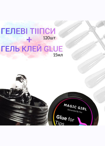 1) Гелеві тіпси Прозорі 120 шт; 2) Gel GLUE гель клей для гелевих тіпс 15 мл . Рідкі тіпси (гелеві тіпси) для нарощування нігтів: Тіпси зроблені з гелю і піддаються опілу і розмочуванню рідиною для зняття гель-лаку. Вони міцні, але пластичні, що дає змогу прикріпити тіпси на нігтики без додаткових зусиль Супер новинка GEL Glue для кріплення (нарощування) гелевих тіпс і створення трендових об'ємних дизайнів. - консистенція густа - тримає форму - не розтікається - легко викладається ап.паличкою на нігтьову пластину, далі встановлюється підготовлена рідка гелева тіпса. Повний час полімеризації - 60 сек у Led лампі. Після полімеризації гель - клей м'який, еластичний немов гума. Спосіб і послідовність використання: Схема під клей гель 1. Підготовка нігтьової пластини - чистка, знежирення. 2. Наносимо Праймер або База Скотч Magic Girl - тонким шаром !!! 3 База, якщо в п.2 використаний праймер 4. Наносимо Клей гель Magic Girl 5. Тіпсу щільно надавати, щоб не було повітря 6. Сушимо в лампі 60сек - 48 ват Гель клей знімається фрезою. Фреза має бути не з дрібною насічкою. Краще використовувати із зеленою насічкою, тоді гель не так сильно забивається в грані фрези. Чому варто замовити тіпси у нас? Найменша товщина тіпси дає змогу уникнути додаткового об'єму. Тіпси Magic Girl відрізняються своєю тонкістю та еластичністю. Саме ці дві характеристики є ключовими, що підтверджують свою назву - рідкі тіпси. Вибирайте свій набір для втілення ваших красивих задумів.