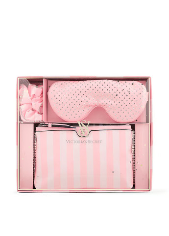 Подарунковий набір для подорожей Victoria Secret. Зберігайте комфорт у дорозі з цим зручним дорожнім набором, в який входять резинка для волосся, маска для сну та косметичка для зберігання всього необхідного. Маска, резинка та косметичка прикрашені стразами. Фірмовий принт-смуги. У цю фірмову косметичку помістяться всі ваші предмети першої необхідності для макіяжу. Підходить для будь-якої косметики, повнорозмірної парфумерії, лосьйонів. Застібка – блискавка. Спереду логотип бренду. Відмінна якість. Розмір косметички: 23 * 14 * 5 см.
