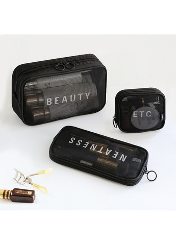 Відправка протягом 1-2 робочих днів.Багатофункціональний та практичний комплект органайзерів для подорожей "Neatness. Beauty. Etc" чорного кольору. Дорожній набір складається з 3 косметичок різного розміру. Органайзери чудово підходять для зберігання та перевезення різних за розміром та призначенням мов: косметики, туалетні приладдя, ліки, документи, заряджання тощо. Усі 3 косметички мають усередині кармашки для розподілу дрібних предметів. Виготовлені з легкого матеріалу - поліефірне волокно, нейлон + щільна сітка, завдяки чому ви відразу побачите, де та що є. Крім цього, завдяки сітці, предмети, а саме вологі зубні щітки, вентилюються і відповідно добре висихають. Для зручності доступу сумочки закриваються на застібку-блискавку з кільцем. Усі матеріали (всередині, зовні, змійці), особливо сітка, дуже якісні та довговічні. Розмір L: 22 * 14 * 7 смРозмір M: 22 * 11 * 2 смРозмір S: 11 * 11 * 2 см</ p] Колір: Чорний;