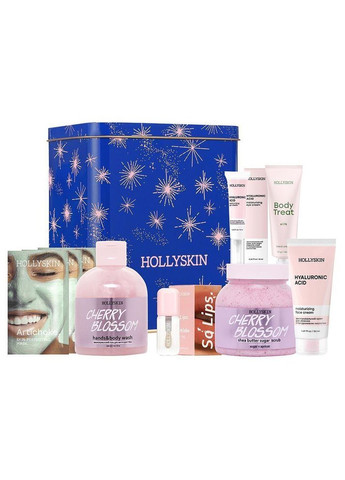 Подарунковий набір HOLLYSKIN Midnight Bloom Подарунковий набір Midnight Bloom – святковий ритуал зволоження, що огортає ніжністю від ранку до вечора. Це ідеальний подарунок для тих, хто мріє про м’яку, гладеньку й сяючу шкіру без зайвих зусиль. У наборі поєднані дві улюблені лінійки HOLLYSKIN: ароматна колекція Cherry Blossom для тіла та зволожувальна серія Hyaluronic Acid для обличчя, що підходить будь-якому типу шкіри. Доповнює ритуал топова охолоджувальна маски з артишоком, крем для рук із затишної лінійки Body Treat і глянцева олійка для губ. Особлива перевага – це пакування. Усі засоби зібрані у стильній металевій скриньці з оригінальним дизайном, створеним спеціально для святкового сезону. Її хочеться зберегти для косметики, листівок, прикрас чи будь-яких дрібничок, які цінні. Усередині: - Зволожувальний гель для миття рук і тіла Cherry Blossom, 300 ml - Цукровий скраб з олією ши і перлітом Cherry Blossom, 300 ml - Зволожувальний крем для обличчя з гіалуроновою кислотою Hyaluronic Acid Face Cream, 50 ml - Крем для шкіри навколо очей з гіалуроновою кислотою Hyaluronic Acid Eye Cream, 10 ml - Живильний крем для рук Body Treat Silk, 30 g - Набір охолоджувальних ліфтинг масок для боротьби з набряками Artichoke. Skin Perfecting Mask, 3 sachets / 10 g - Зволожувальна олія для губ So Lips. Peptide Lip Oil 001. Lemon Glaze, 4 ml