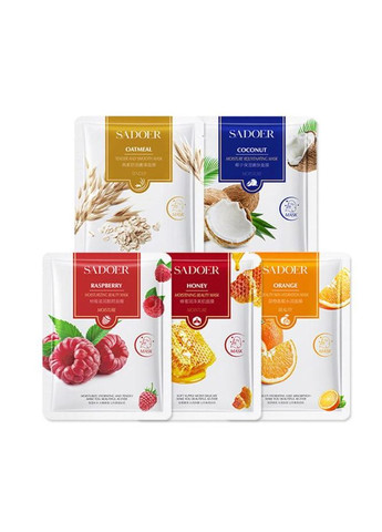 1. Тканинна маска для обличчя з екстрактом пшениці Sadoer, 25 г 2. Тканинна маска для обличчя з екстрактом кокоса Sadoer, 25 г 3. Зволожувальна тканинна маска для обличчя з екстрактом малини SADOER, 25 г 4. Тканинна маска для обличчя з екстрактом меду Sadoer, 25 г 5. Тканинна маска для обличчя з екстрактом апельсина Sadoer, 25 г.