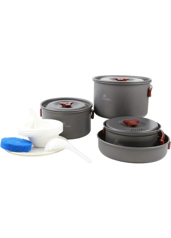 Набір посуду Fire-Maple FM Feast 5 - включає в себе все найнеобхідніше для приготування їжі в польових умовах. Сковорода об'ємом 1 літр, казанок об'ємом 1 літр, казанок - 1,7 літра і ще один казанок об'ємом 2,7 літра забезпечать достатнім об'ємом невелику компанію з 4-5 осіб. Крім того, до набору входить зручний чайник об'ємом 800 мл, який стане незамінним аксесуаром для приготування гарячих напоїв у будь-який час дня. Складана конструкція ручок полегшує транспортування і зберігання набору, а також робить його компактним і зручним у використанні. Завдяки спеціальній технології, ручки не нагріваються під час приготування їжі, забезпечуючи безпеку і комфорт. Набір виконаний з анодованого алюмінію, що робить його легким, міцним і стійким до корозії. Казанки постачаються з кришками, які мають зручну перфорацію, що дає змогу використовувати їх як сито для швидкого зливу води. Крім основних елементів, набір також включає кілька глибоких мисок, мочалку для миття посуду і лопатку для приготування їжі, забезпечуючи все необхідне для комфортного та ефективного приготування їжі в поході. Лопатка допоможе уникнути пригорання їжі, а мочалка полегшить процес миття посуду. Після використання всі деталі набору легко і компактно складаються, займаючи мінімум місця під час транспортування. У комплекті з набором йде зручний чохол, який забезпечує безпечне і зручне транспортування всього комплекту. Чохол захищає посуд від пошкоджень і зберігає його в чистоті, а також дає змогу легко організувати та зберігати всі елементи набору в одному місці. Набір посуду Fire-Maple FM Feast 5 - це надійний супутник для всіх любителів активного відпочинку та подорожей на природі. Незалежно від того, вирушаєте ви в похід, на пікнік чи просто хочете насолодитися приготуванням смачних страв просто неба, цей набір посуду буде ідеальним вибором для вас.