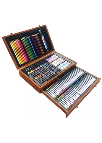 Творчий набір із 180 предметів у дерев'яній валізці стане ідеальним подарунком для молодих творців, захоплених мистецтвом і малюванням, надаючи їм все необхідне для самовираження і створення дивовижних художніх творів. Кожен елемент цього набору виготовлений з безпечних і високоякісних матеріалів, спеціально підібраних для дітей. Яскраві і насичені фарби, легкість малювання олівцями і відсутність розмазування маркерів роблять цей комплект ідеальним інструментом для втілення творчих ідей. Поставляється в стильному дерев'яному кейсі зі зручною ручкою для перенесення і зручного зберігання. Характеристики: - Тип товару: набір для малювання; - Розміри кейса: 53х31х5 см; - Вага: 1700 г; - Кейс: дерев'яний чемоданчик; - Замки: металеві. Комплектація: - Кейс; - Фломастери - 56 шт; - Олівці олійні - 40 шт; - Олівці пастель - 40 шт; - Кольорові олівці - 20 шт; - Фарби акварель - 12 кольорів; - Тертка; - Клей; - Пензлик; - Простий олівець; - Точилка; - Лінійка; - Скріпки; - Упаковка.