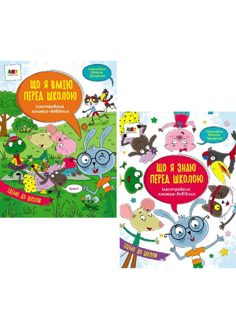 Опис: Книга 1. Ілюстрована книжка-довідник. Що я знаю перед школою Базові знання, що отримала ваша дитина перед школою, у книжці-довіднику для майбутніх першокласників. У веселій компанії кумедних друзів майбутній першокласник повторює свої знання з читання, письма, математики, творчості, англійської, довкілля, правил безпеки і поведінки. Формат, мм:230х325 Книга 2. Ілюстрована книжка-довідник. Що я вмію перед школою Базові вміння, що має отримати ваша дитина перед школою, у книжці-довіднику для майбутніх першокласників. Яскраво, смішно, пізнавально, досліджуючи дитина повторить про хороші манери, ввічливу поведінку, навички самостійності, корисну їжу, дізнається про школу та шкільне життя. Формат, мм:230х325
