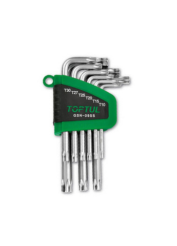 Відправка протягом 1-2 робочих днів. Набір Г-обр. ключів TORX T10-T50 9од. TOPTUL GSN-09SS Xapaктеристики: Кількість одиниць: 9 шт. Material: S2 Робочий профіль: TORX Система виміру: Метрична Розмір: T10, T15, T20, T25, T27, TЗ0, T40, T45, T50 Тип ключа: шестигранний; Набір ключів: ключи однотипні; Кількість ключів у наборі: 9;