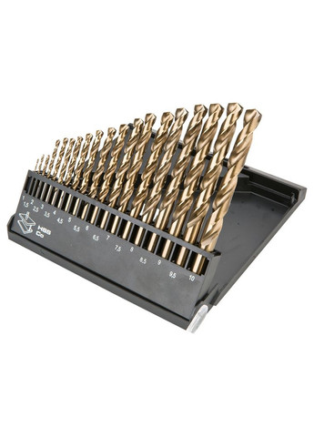 Набір свердел по металу GRAPHITE (арт. 57H199) діаметрами від 1.0 мм до 10 мм, виготовлених зі сплаву швидкорізальної сталі 9341. Додаткове покриття шаром азоту титану дозволяє зменшити опір під час різання та зберегти високу якість просвердлюваних отворів, насамперед під час свердлення отворів за допомогою свердлильних станків. Кут при верхівці 135° і корекція зрізу дозволяє з легкістю свердлити отвори без попереднього розмічення. Ідеально підходять до свердлення в сталі, чавуні, елементах із кольорових металів (мідь, алюміній, мосяж).