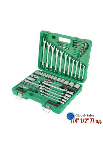 Набір складається з 77 одиниць із робочими квадратами 1/2" і 1/4", практичний і надійний в експлуатації. Всі насадки виготовлені з високоміцного хромо-ванадієвого сплаву, що забезпечує високі експлуатаційні характеристики, а також захист від корозії. Набір укомплектований у зручний пластиковий кейс. Наявність великого набору ріжково-накидних, шарнірних і Г-подібних ключів, двох ключів-тріскаток, торцевих головок і різноманітних викруткових біт робить набір дуже універсальним і дає змогу здійснювати практично будь-які ремонтні роботи не тільки вдома, а й у гаражі чи майстерні. Завдяки суворому дотриманню технології виробництва, весь інструмент характеризуються точністю й браком дефектів. Шарнірні ключі: 8-15 мм; Габаритні розміри: 395х295х80 мм; Розмір ріжково-накидних ключів: 7-19 мм; Квадрат: 1/2"1/4"; Кількість одиниць у наборі: 77 од.; Матеріал валізи: пластик