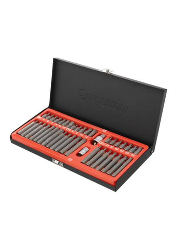 Призначення Набір насадок призначений для монтажу та демонтажу різних кріплень із відповідним типом шліца. Цей комплект змінних біт і шестигранників підходить для використання в ручному інструменті: для викруток, тримачів, тріскачок, так і в електроінструменті: для дрилів, шурупокрутів. Матеріал виготовлення Усі насадки виготовлені з високоякісної загартованої Cr-V сталі. Присадки хрому та ванадію в складі підвищують витривалість, стійкість до критичних навантажень і захищають насадки від появи корозії. Вирізняються підвищеною надійністю, міцністю й довгим терміном експлуатації. Кейс Весь набір поміщений у міцний металевий кейс, який закривається клямкою з металу. Зручно транспортувати та зберігати набір, всі насадки розміщені в персональних пронумерованих відділеннях — ви швидко знайдете необхідну биту. Комплектація Набір складається з 40 предметів. Різноманітність біт і шестигранників (TORX, HEX, Spline) у двох розмірах 30 і 75 мм дають змогу ефективно працювати у важкодоступних місцях і гарантують надійне зчеплення зі шліцом кріплення. TORX 30 мм: T20, T25, T30, T40, T45, T50, T55; 75 мм: T20, T25, T30, T40, T45, T50, T55; HEX: 30 мм: H4, H5, H6, H7, H8, H10, H12; 75 мм: H4, H5, H6, H7, H8, H10, H12; Spline: 30 мм: M5, M6, M8, M10, M12; 75 мм: M5, M6, M8, M10, M12; Перехідники 10 мм — 1/2, 3/8". Кількість одиниць у наборі: 40 од.; Перехідник: 1/2", 3/8"