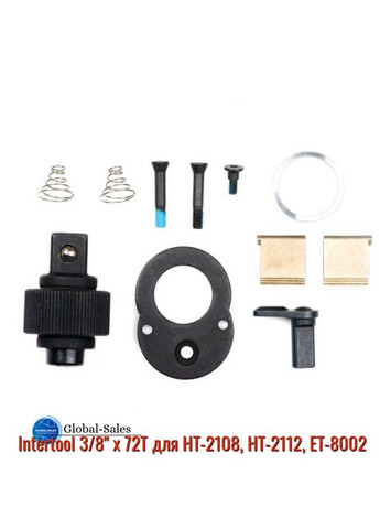 Ремонтний комплект до ручок із храповим механізмом 3/8", 72 зуби. Підходить для тріскачок HT-2108 і HT-2112, а також до тайванських тріскачок інших виробників, з розміром посадкового квадрата 3/8" і храповим механізмом у 72 зубці. Кількість зубів: 72; Кількість одиниць у наборі: 11 од.; Квадрат: 3/8"; Сумісність: HT-2108, HT-2112, ET-8002