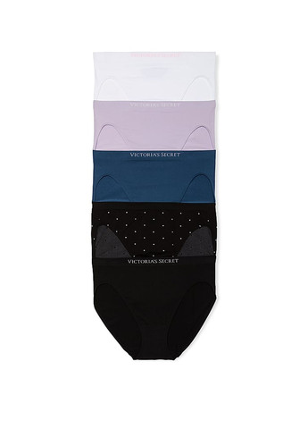 Жіночі гладкі трусики Victoria's Secret. Набір з 5 трусиків різних кольорів. Зручна посадка. М'який, дуже приємний до тіла матеріал. Одні трусики з принтом у горошок, інші – однотонні з логотипом бренду на резинці. Відмінна якість.