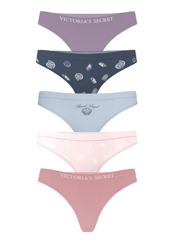 Набір жіночих трусиків Victoria Secret. Зручні трусики тонг із середньою посадкою. У наборі 5 трусиків різних кольорів - 2 однотонні з логотипом на гумці і ще 3 з принтом у морській тематиці. М'яка, приємна до тіла тканина. Відмінна якість.