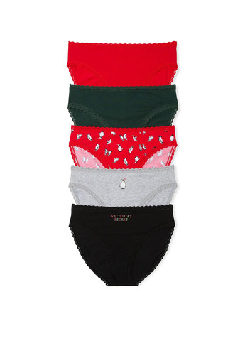 Комплект трусів від бренду Victoria's Secret виконаний з м'якої еластичної сумішевої бавовни. Комплект складається з п'яти трусів: сині з принтом, сірі, рожеві, білі з принтом і чорні. Модель бікіні із середньою посадкою та еластичною брендованою гумкою по поясу. Універсальна модель, перевірена часом, добре сідає по фігурі та підкреслює форми.