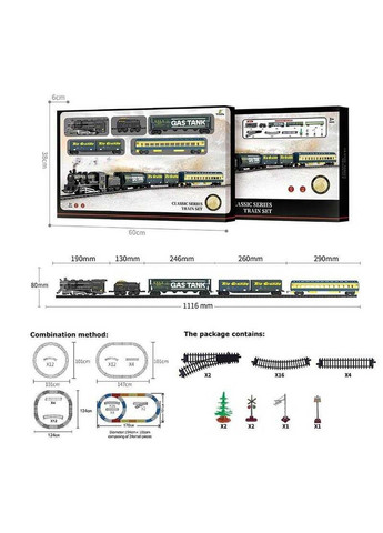 Залізниця Classical Train - це цікавий набір з 13 елементів, що включає локомотив, вагон, 10 деталей дороги та платформу. Локомотив рухається вперед, створюючи реалістичні звукові ефекти, світить фарами та випускає дим, занурюючи в атмосферу справжнього поїзда. Працює від 4-х батарейок АА (немає в комплекті). Розмір дороги 134 х 75 см.