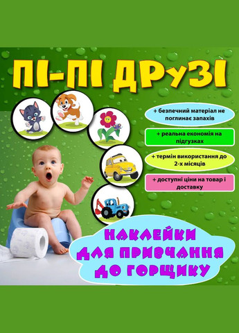 Навчальні наклейки для горщика Smart Potty, це новий метод для привчання малюка до горщика. Багато мам погодяться, як складно буває привчити малюка ходити на горщик, але тепер у мам є помічник Стікери баблз! Наклейки допоможуть привчити дитину до горщика без сліз, вам не потрібно примушувати та вмовляти малюка. Навчай граючись! Як працюють стікери smart potty від bubblze: При контакті з теплою водою на наклейці проявляється картинка з намальованою твариною, яка однозначно зацікавить малюка! Після висихання малюнок зникне та з'явиться при наступному контакті з теплою рідиною. Наклейка підходить для будь-якого горщика, діаметр наклейки 7 см Навчальна наклейка для горщика безпечна для малюка, виготовлена зі 100% вінілу, який не вбирає запахи. Стікери підходять для найвужчого горщика! Діаметр наклейки 7 мм. Наклейка для привчання до горщика багаторазові, 10-12 тижнів використання. Інструкція по застосуванню: Приклейте стікер на суху, знежирену поверхню горщика або унітазу; Покажіть дитині, як з допомогою теплої води проявляється картинка. Дочекайтеся поки малюк сходить на горщик, змийте холодною водою. Ваш помічник Smart Potty готовий до наступного використання. Зображення у наклейках можуть відрізнятися від тих, які на фото