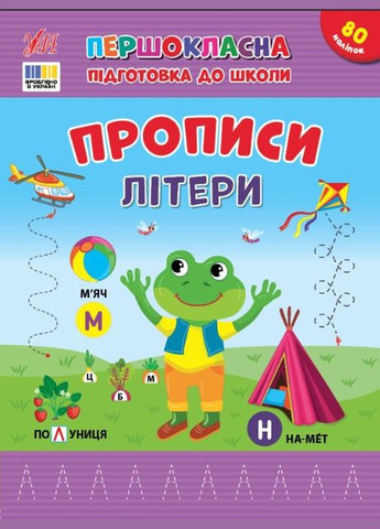 "Прописи. Літери" — це зошит із серії «Першокласна підготовка до школи», створений для дітей 5–6 років. Посібник допомагає малюкам вивчити літери українського алфавіту, навчитися їх правильно писати, а також розвиває дрібну моторику, увагу та зорову пам’ять. Зошит містить: вправи на обведення літер по пунктиру; завдання на впізнавання літер у словах; малюнки для розфарбовування; логічні ігри, завдання на відповідність і з'єднання; вправи з наліпками (наклейки зазвичай додаються) Це ідеальний помічник для батьків і педагогів у підготовці дитини до школи.